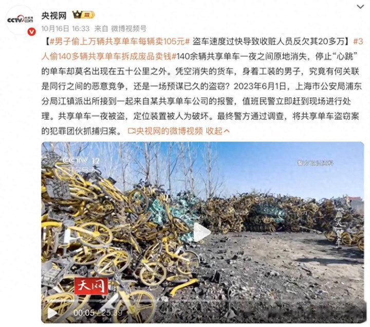 从法律层面看,此类行为已构成盗窃罪。根据《刑法》规定,盗窃数额特别巨大(通常30万元以上)可处十年以上有期徒刑乃至无期徒刑。尽管单辆卖价仅百元左右,但量刑依据的是车辆实际价值(一辆共享单车成本约2000元),而非销赃获利,此前哈尔滨类似案件中,盗窃1100辆单车获利7万元的主犯就被判处11年有期徒刑 。偷万辆共享单车仅每辆卖105元,看似“小利”实则是“巨罪”。罪犯心存侥幸,以为拆卖难追查,却不知法律量刑看车辆实际价值。这种损人利己的行为,既破坏公共资源,又触碰法律红线,最终只能自食牢狱之灾的苦果。法律从不姑息此类犯罪,“低价销赃”不是免罪符,切勿因一时贪念,付出沉重的法律代价。